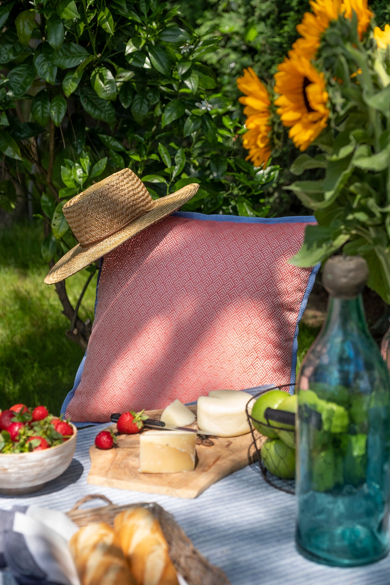 2023 İlkbahar/Yaz koleksiyonumuzun bir parçası olan desenli biyeli dekoratif yastığımız dış mekan kumaştan yapılmıştır. Güneşte solmaz, leke tutmaz, su geçirmez yastıklarımızı dış mekanda rahatlıkla kullanabilirsiniz.