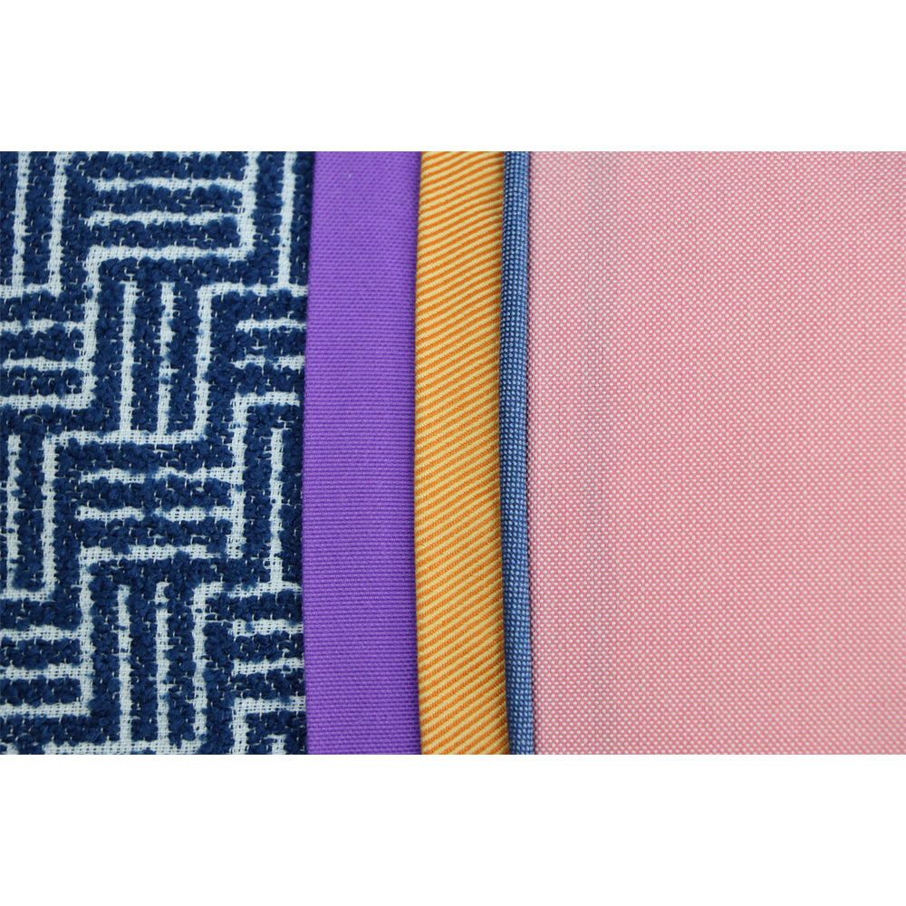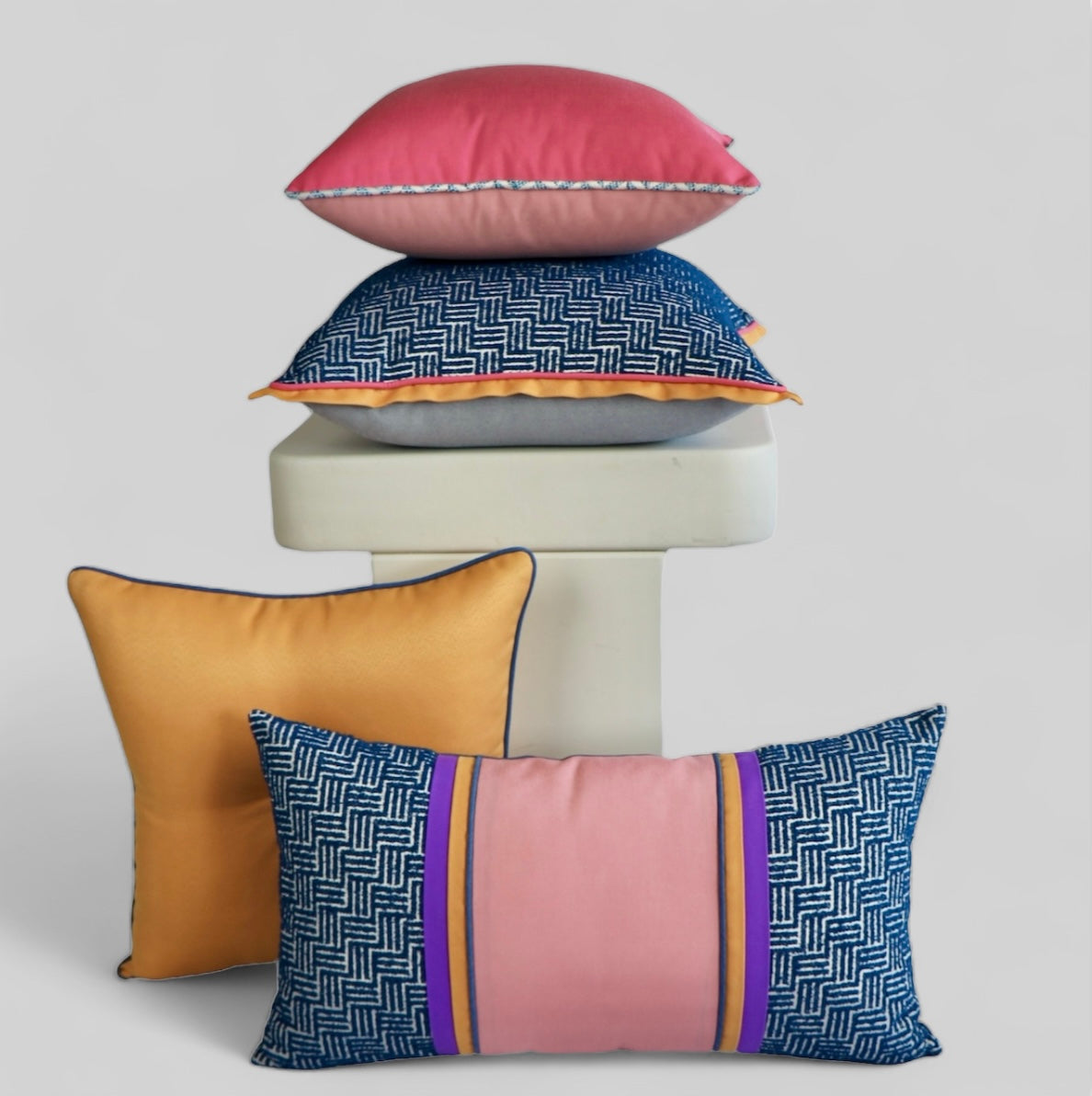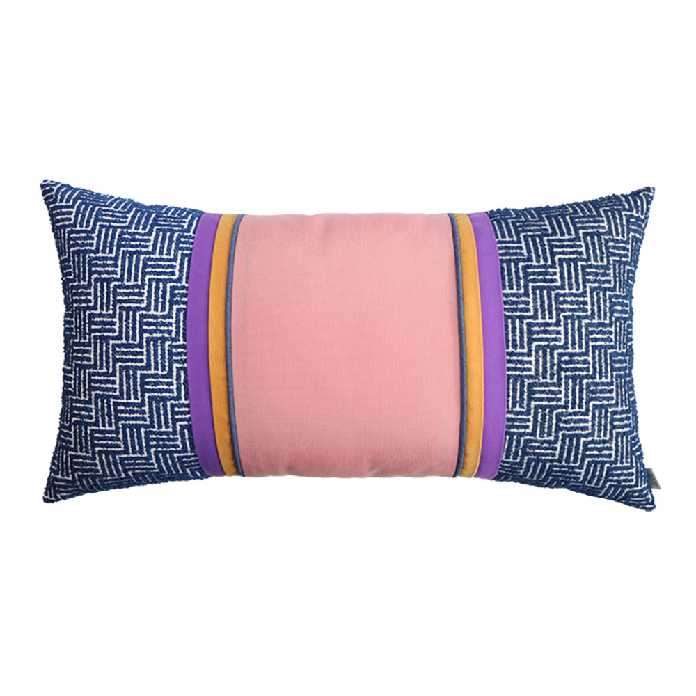 Dikdörtgen pembe bantlı, mavi fitilli, turuncu ve mor biyeli, kendinden desenli dekoratif yastık.